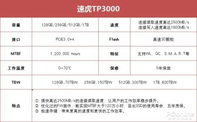 速虎TP3000优化了FW固件。采用了动态磨损平衡算法。采用了静态磨损平衡算法。运用了坏块生命周期管理技术。应用了掉电保护技术。这些技术组合后。大幅提升了产品稳定性。大幅提升了产品可靠性。