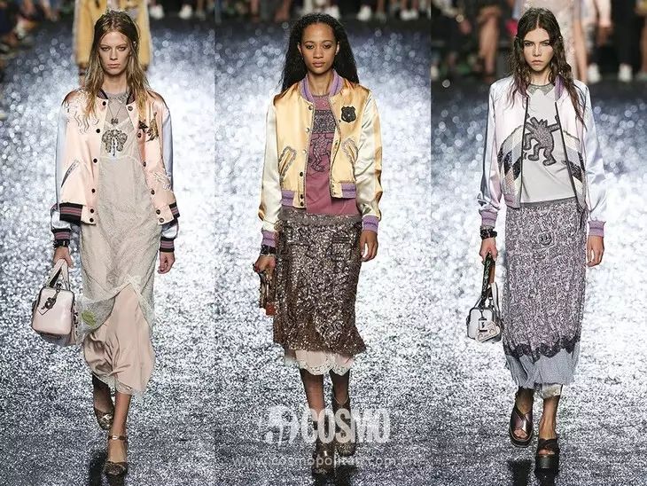 这一季的时装周上,呈现了一种别具一格的潮流。它巧妙地将朋克的深邃与少女的甜美融为一体。现场,摇滚风元素比比皆是,如熠熠生辉的珠片和涂鸦。此外,80年代的翻领外套和棒球服也频繁出现在舞台上。尤其是那些珠片,它们在T台上闪烁,与模特们的服饰相映成趣,带来了强烈的视觉冲击。